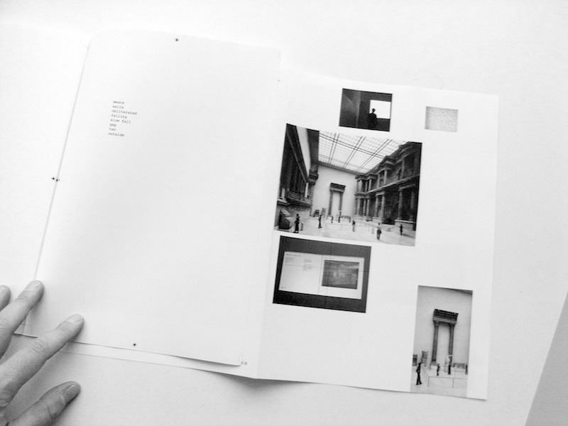 Throughout eight hours the voice of one reader and the lines of two writers were given space to coincide and fall apart again. Yet, pushing for a col- lapse of that given situation the aim of this rehearsal was to speculate on a brief suspension that would allow for the appearance of a gap within lan- guage itself. The script present here comes forth from these attempts.